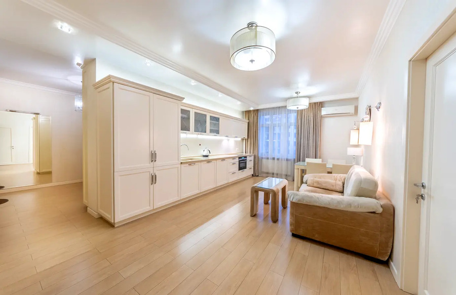 A three-room designer apartment is offered for sale in the business-class residential complex "Chicago", with a total area of 105 meters. The apartment has been renovated with environmentally friendly materials in light, soft colors, fully equipped with all the necessary appliances and furniture from leading world manufacturers.kitchen living room with dining area ... ( 105 m2)